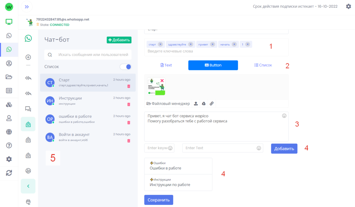Кнопки в WhatsApp работают как при использовании чат бота так и при массовой whatsapp рассылке. Вы можете создать одного чат бота или рассылку сразу для всех подключенных whatsapp аккаунтов в сервис wapico