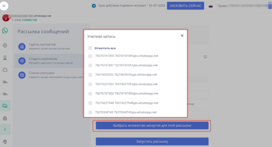 При создании рассылки в разделе «Создать компанию» есть кнопка «Выбрать множество аккаунтов для этой рассылки» после нажатия на кнопку выйдет всплывающее окно где необходимо ответить аккаунты, которые будут участвовать в данной рассылке